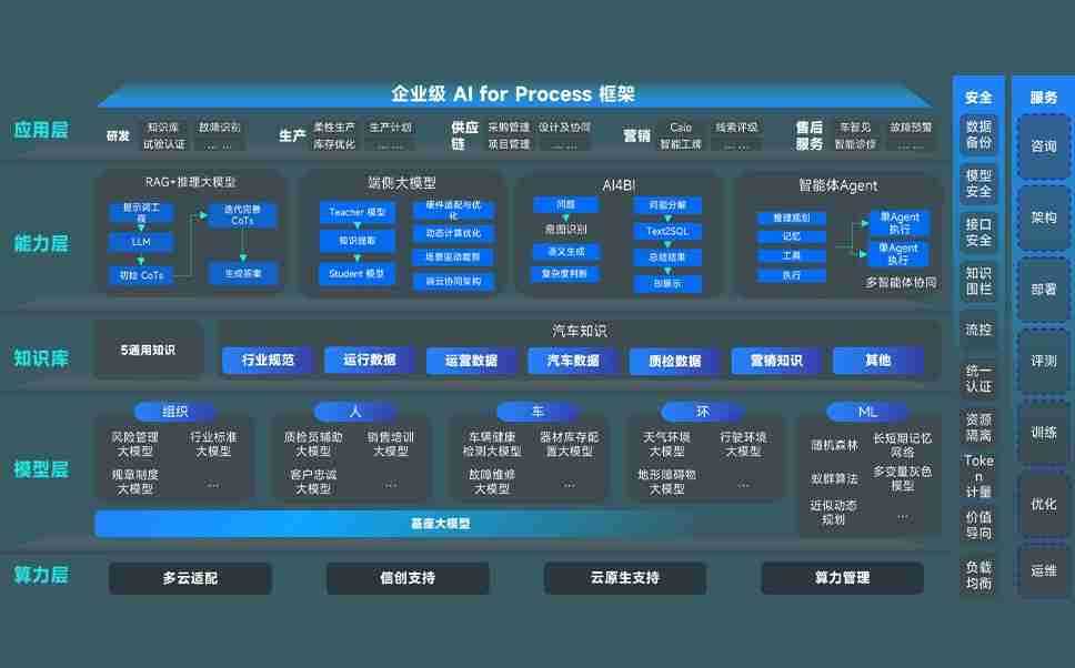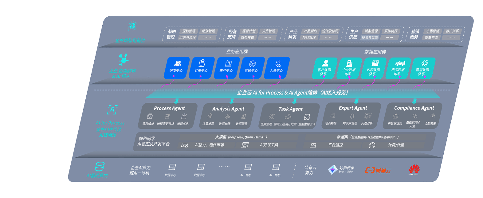 端到端的一站式AI工作空间深度融合了从企业战略规划到日常经营的全流程业务板块,,定向解决车企内部领域多、、、、部门多、、、、链条长、、场景碎片化等难题,,,支持车企快速构建以AI为核心的生产力写作体系,,实现任务执行与AI能力的无缝集成与交互