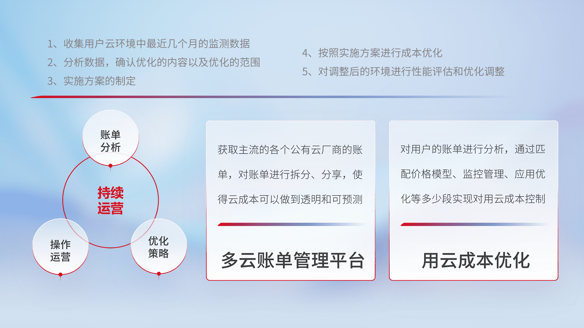 通过多云纳管,,,以统一的资源数据模型把客户的云资源进行抽象和封装,,,进而实现对多云资源的统一操作,,保障云资源管理的可靠性、、、、稳定性与可用性。。量身定制化运维内容,,,配置、、、、开发运维、、、、补丁管理、、备份、、、监控、、、、认证和访问管理、、、、审计和日常巡检等,,,保障在用云过程中的可靠度,,,,稳定度以及高可用率。。。